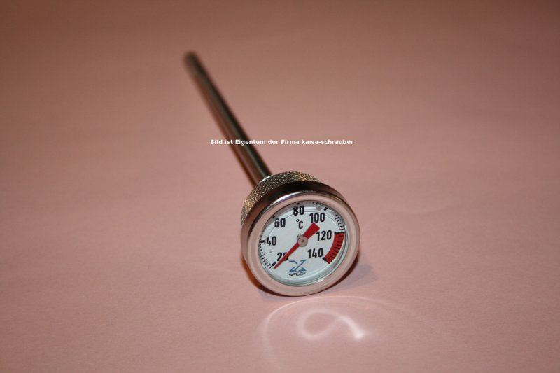 Ein Motorradmotor sollte immer auf Betriebstemperatur sein, bevor er seine Leistung voll entfaltet. Das schont alle Bauteile und sorgt für Langlebigkeit. Die Temperaturanzeige im Cockpit (sofern vorhanden) zeigt in der Regel die Wassertemperatur an. Wichtig ist aber die Öltemperatur!  Mit unseren Qualitäts-Thermometern kannst Du die Öltemperatur genau ablesen und haben immer mit einem kurzen Blick den Überblick! Ein roter Bereich ist bei fast allen Ölthermometern im Schauglas gekennzeichnet, eventuelle Motorüberhitzungen können sofort festgestellt werden, da das Thermometer unmittelbar reagiert, immerhin sitzt es genau da, wo auch die Temperatur gemessen werden soll! Einfache Montage. Die Thermometer werden einfach anstelle der Öleinfüllschraube eingesetzt. Der mitgelieferte Gummiring (hitzefest) sorgt für die Dichtigkeit. Im Schauglas befindet sich eine Luftblase, das ist kein Konstruktionsmangel, sondern hat etwas mit der Kühlung (Ausdehnung Kühlflüssigkeit) im Schauglas selbst zu tun. Die Qualität der Teile ist wie immer bei uns von allererster Wahl!