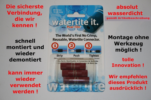 Diese Kabelverbindungen sind komplett wasserdicht, können auch unter Wasser verwendet werden, ideal im Hardcore Motocross-Bereich oder sogar für Aquarien unter Wasser einsetzbar! Bitte unbedingt den Kabeldurchmesser beachten, wenn der Kabeldurchmesser zu klein ist, kann nicht garantiert werden, daß die Verbindung 100% dicht ist!